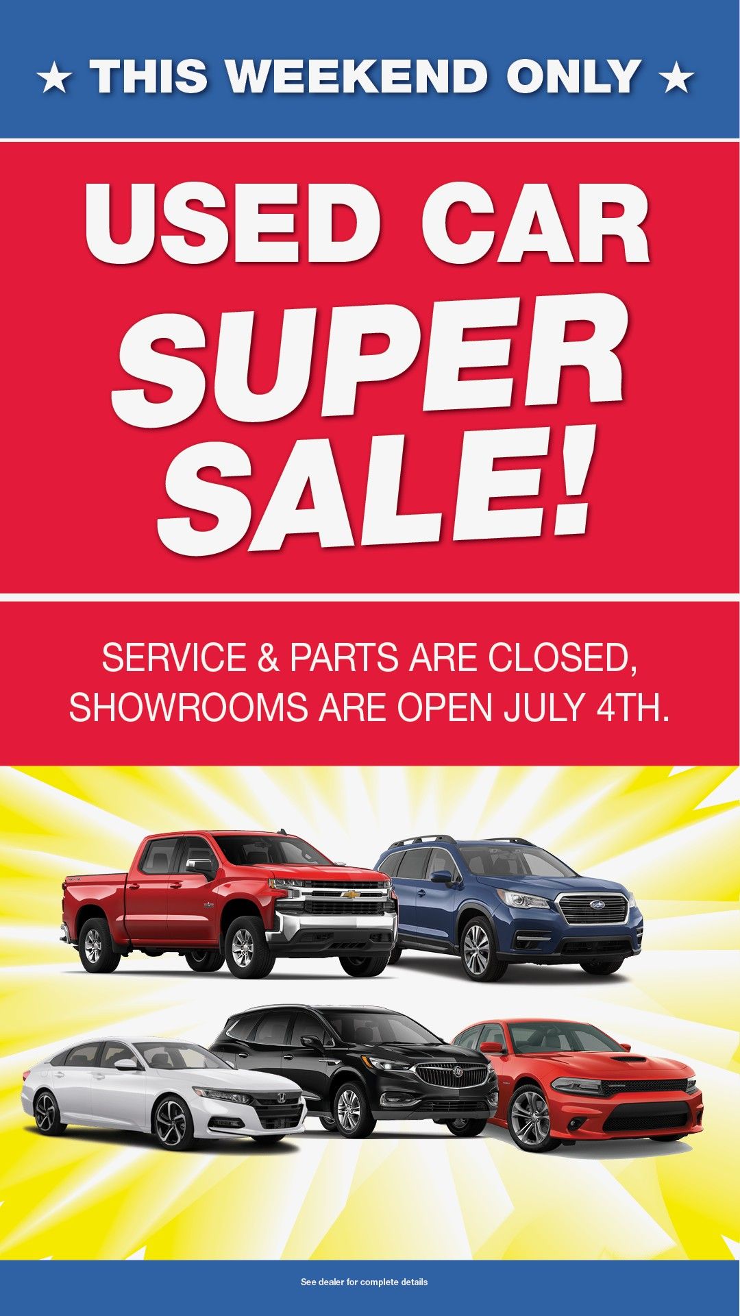 Our July 4th Used Car Super Sale is slated to start on Friday, July 4th and run through Saturday, July 5th. Please note: our Honda Service Center and Honda Parts Department will be Closed on July 4th.
