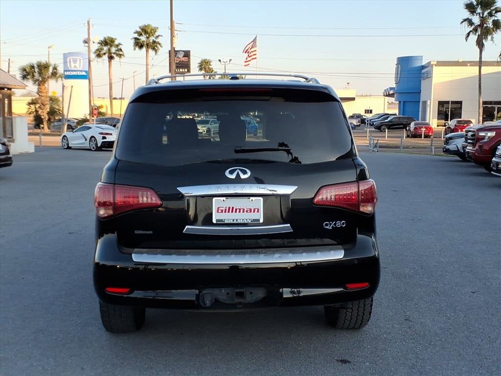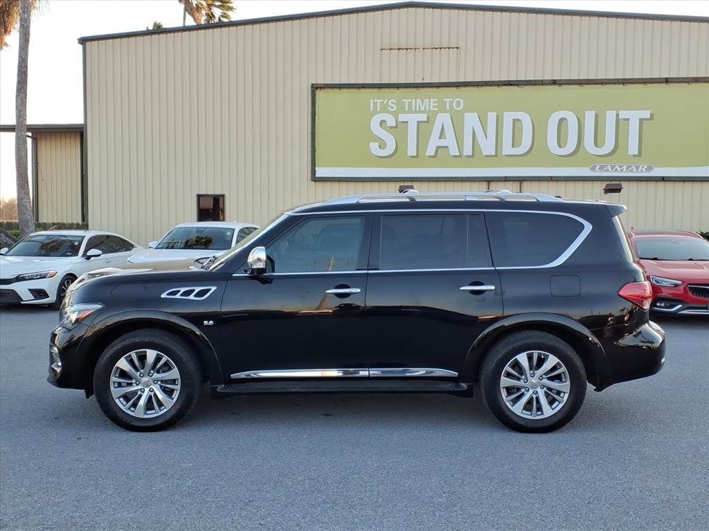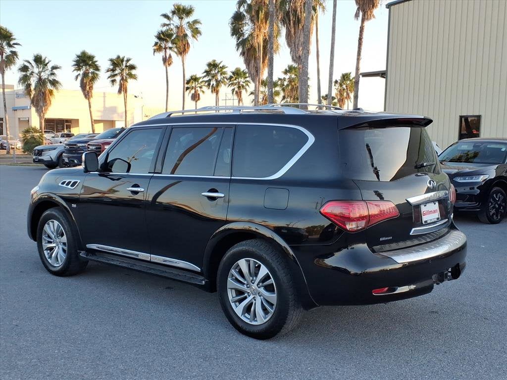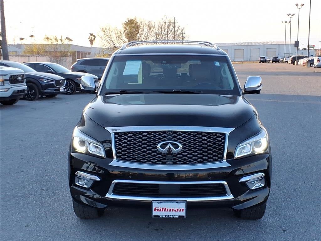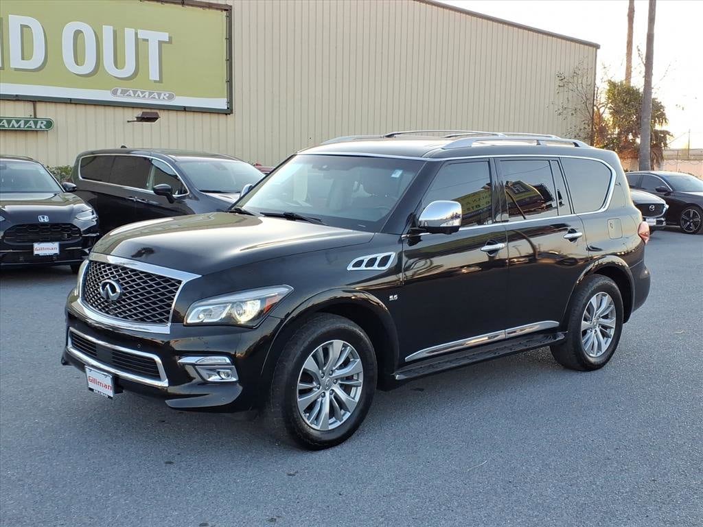 Gillman's Lifetime Engine Warranty lasts as long as you own your vehicle - free with the Gillman Pre-Owned Promise. If the vehicle isn't right for you, return it in purchase condition within 2 days or 200 miles as part of our Happy-Driving Guarantee. Experience luxury and power in this stunning black 2016 INFINITI QX80 AWD SUV. Equipped with a robust 5.6L V8 engine producing 400hp and 413 lb-ft of torque, this full-size SUV delivers confident performance in any condition with its advanced AWD system and 7-speed shiftable automatic transmission. Enjoy a premium interior featuring leather-trimmed upholstery, heated front seats, a heated steering wheel, and a power glass moonroof. Stay connected and entertained with the 8-inch touchscreen infotainment system, Bluetooth connectivity, SiriusXM satellite radio, and a premium Bose sound system. Safety is paramount with rear and front parking sensors, a rear multi-view camera, blind-spot warning, and multiple airbags. Additional highlights include INFINITI Connection satellite communications, navigation with real-time traffic, power folding third-row seats, and rear air suspension for a smooth ride. Convenience features such as remote engine start, proximity entry, power rear liftgate, and memory settings for driver seat, steering wheel, and mirrors make every drive a pleasure. Perfect for families or anyone seeking refined capability and space. All vehicles subject to prior sale. We are not responsible for typographical errors and may change information without notice. Photos may not depict the actual vehicle. Tax, title, and license fees not included. Dealer Discount available to all buyers.Vehicles purchased from Gillman Automotive Group include a Bring It Back Guarantee: return the vehicle in purchase condition within two days or 200 miles. New current-model-year vehicles and qualifying pre-owned vehicles (under 90,000 miles and less than 7 years old) are eligible. Guarantee is non-transferable and has no cash value. Lifetime Warranty available on select pre-owned vehicles. See dealer for details; restrictions may apply.